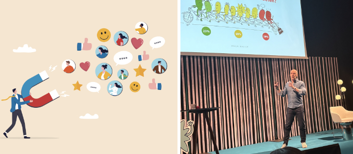 Upp på scen strider Niklas Delmar, medgrundare till konsultbolaget Hejangagemang till en artig applåd från publiken.
