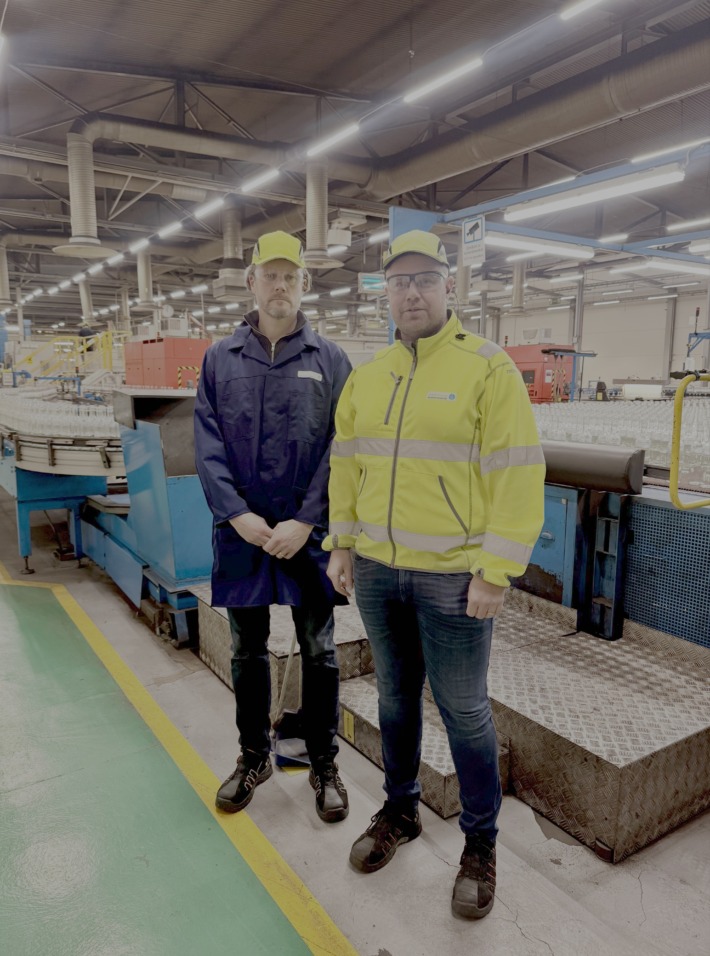Och det märks när vi tar på oss skyddskläderna och går ut i produktionen. Tusentals stora och små glasflaskor fyller rullbanden inne i de stora fabrikshallarna och medarbetarna vinkar och hejar glatt på Rickard Palmqvist och Esbjörn Johansson när vi passerar dem.